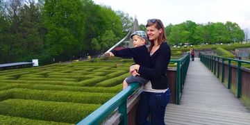 Wer das Ziel in der Mitte des Gartens erreicht, kann von der alles überspannenden Brücke anderen Besuchern beim Verlaufen zuschauen. Ganz mutige Besucher können mit der Seilbahn über die gesamte Anlage fliegen.