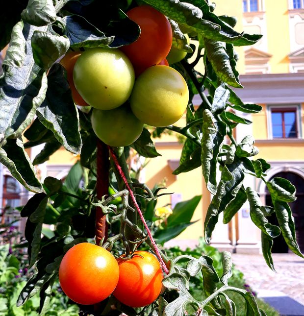 In die Kübel der Reichenstraße kamen Litchi-Tomaten, die nicht nur mit ihrem ungewöhnlichen Stachelwuchs besonders sind, sondern auch durch den Geschmack nach Kirsche. Hier sind schon erste Fruchtansätze zu erkennen. In der stacheligen Hülle verbirgt sich ein Kügelchen, das sich zu einem roten, fruchtig-süßen Leckerbissen entwickeln wird.