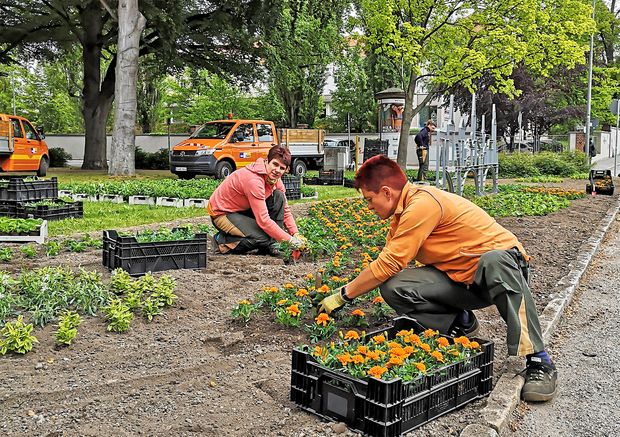 Nachdem die bildlich dargestellte Melodie „Nun fängt das schöne Frühjahr an“ auf dem Blumenbeet an der Ziegelstraße verklungen ist, zeigt sich das Beet nun im Sommer mit einem aufwendig gestalteten Muster. Die Gärtner der BBB mbH hatten dabei die schwierige Aufgabe, das anspruchsvolle Dekor detailgetreu auf den Boden so zu übertragen, dass auch die vorgegebenen Pflanzenstückzahlen in den farbigen Feldern ausreichten und am Ende nichts übrigblieb. Knapp 3000 Begonien, Buntnesseln, Petunien, Studentenblumen und Prachtkerzen malen ein schwungvolles, kontrastreiches und wirklich gelungenes Bild in die Mitte der Stadt.