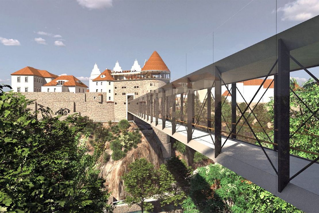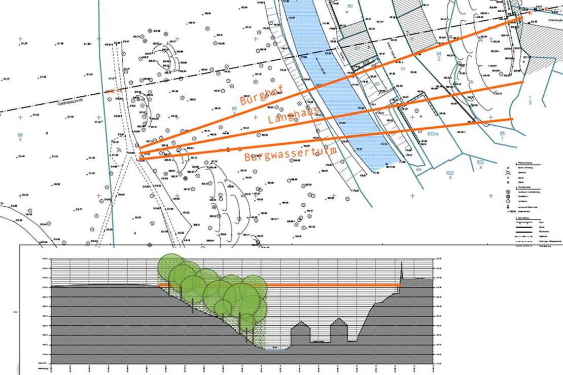 Ausführungen von Ehrlich Architekten GbR: Die geplante Brücke hat eine Anschlusshöhe auf der Protschenbergseite, die ca. 3 m unter dem Höhenniveau des Ortenburghofes am vorbereiteten Zugang zum Langhaus liegt. Vom Parkplatz auf der Protschenbergseite über das Langhaus bis zum Ortenburghof ist eine barrierefreie behindertengerechte Zuwegung ausführbar.