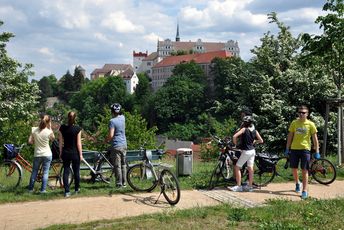 Approaching from the west, you will ride through the villages of Schmochtitz and Temritz to reach Bautzen. You will first come to the district of Seidau, where the path winds through the narrow streets and crosses the river Spree. Then, following the river Spree, cycle route takes you along the base of a mighty granite rock outcrop. From here you can already see the ensemble of the Ortenburg Castle and the Nikolai Church ruins high above the river Spree. The path leads up to the town center via the Gerberstraße.