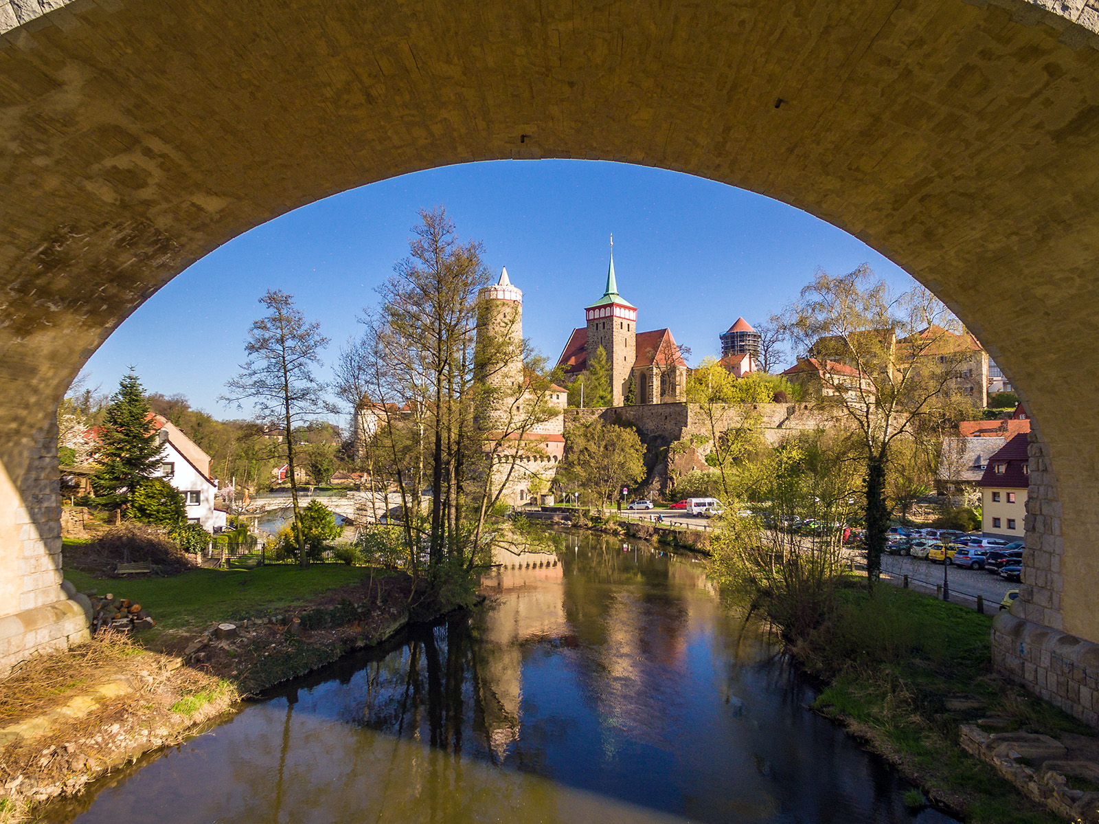 Blick durch die Friedensbrücke auf die Alte Wasserkunst und die Michaeliskirche
