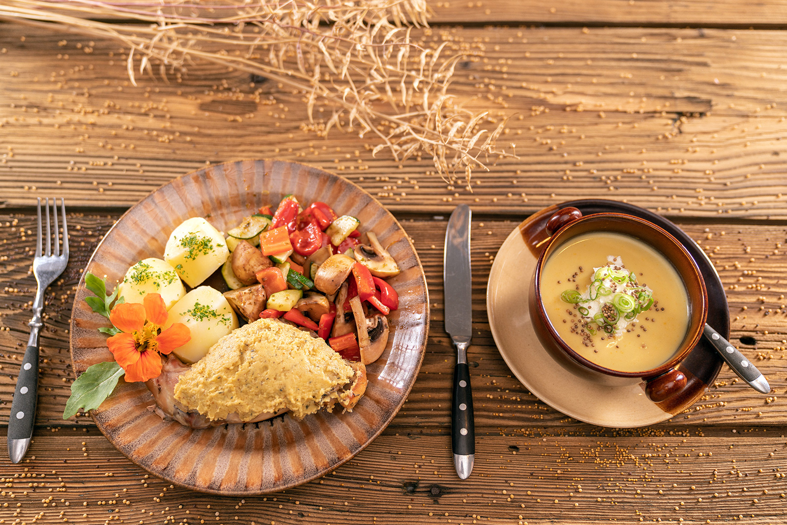 Keule vom Stallhasen mit einer Kräuter-Senfkruste, mediterranes Gemüse, Petersilienkartoffeln und Riesling-Senf-Süppchen mit Sahne und feinem Lauch – Restaurant Zum Haseneck