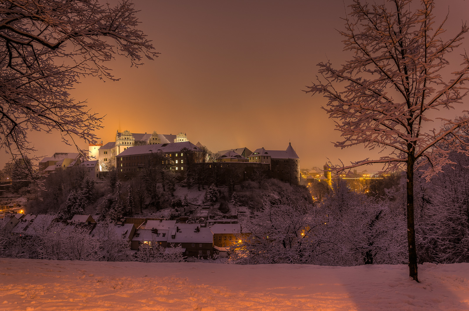 nächtliche Altstadt von Bautzen im Winter mit Ortenburg, Burgwasserturm und Alter Wasserkunst vom Protschenberg aus gesehen