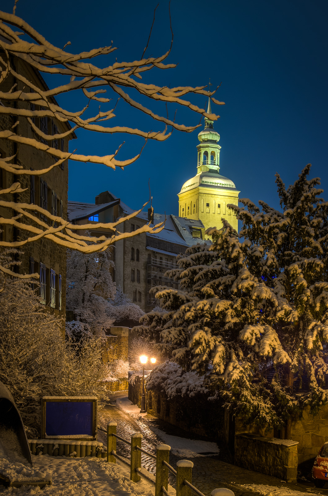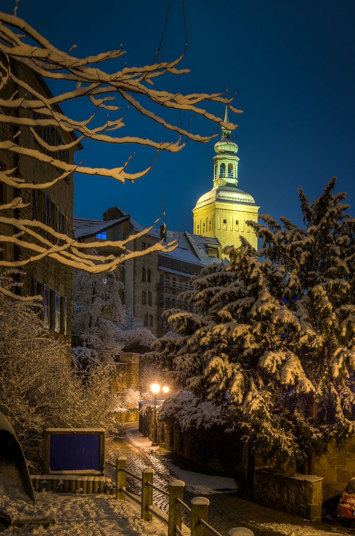 Bautzener Lauenturm am Winterabend vom Michaeliskirchhof aus gesehen