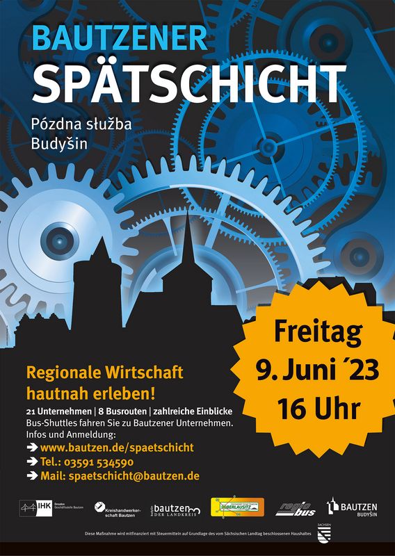 Aus diesem Grund hat die Wirtschaftsförderung der Stadt gemeinsam mit der Industrie- und Handelskammer Dresden, Geschäftsstelle Bautzen, und der Kreishandwerkerschaft Bautzen ein Projekt entwickelt, das interessierte Bürgerinnen und Bürger direkt zu unseren leistungsfähigsten Unternehmen bringt. Am 8. Juni 2018 findet die Erste Bautzener Spätschicht statt. Insgesamt präsentieren sich 24 Unternehmen auf 8 verschiedenen Routen. Alle Interessierten können sich auf der Website der Stadt www.bautzen.de/spaetschicht über das Event informieren und sich dort anmelden.