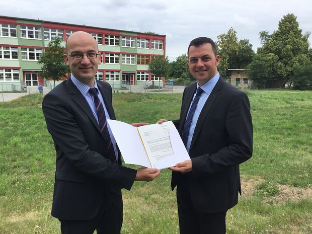 Gute Nachrichten für die Stadt Bautzen: Vize-Landrat Udo Witschas übergab am 14. Juni 2018 an Bürgermeister Dr. Robert Böhmer einen Fördermittelbescheid für die neue Kindertagesstätte der Stadt Bautzen am Schützenplatz. Künftig sollen hier 36 Kinder in der Krippe, 135 Kindergartenkinder und 15 Kinder im Hort betreut werden. Insgesamt werden rund 5,6 Millionen Euro investiert. Davon steuert der Landkreis aus verschiedenen Förderprogrammen rund 2 Millionen Euro bei, der Freistaat über das Programm „Brücken in die Zukunft“ weitere 2,4 Millionen Euro.
