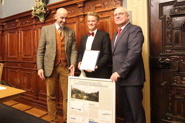 Insgesamt waren 5 Konzepte im Rennen. Diese befassten sich mit einer Bogenbrücke, einer vorgespannten Spannbandbrücke, eine asymmetrische Hängebrücke mit A-Pylon, einer Spannbandbrücke aus Leichtbetonsegmenten mit CFK-Spanngliedern und einer zugversteiften Hängebrücke mit Fachwerküberbau. Alle Arbeiten wurden nach technischen aber auch nach standortbezogenen Kriterien bewertet. Das Rennen machten die beiden Spannbandbrücken. Sie zeigten das höchste Umsetzungspotential, lassen aber noch eine Reihe von Fragen offen. Vielleicht war das auch der Grund, dass kein erster sondern zwei zweite Plätze vergeben wurden. Die Idee der Vorgespannten Spannbandbrücke ist das Ergebnis der Diplomarbeit von Herrn Anton Meinig (Foto), die CFK-Spannbandbrücke eine gemeinschaftliche Belegarbeit von Niclas Oette, Paul Wehrmann und Christoph Holzapfel. Die TU Dresden hat es sich nicht nehmen lassen, die beiden Entwürfe mit einem Preisgeld auszuzeichnen. Am 29. Oktober 2018 wurde die Auszeichnung im Bautzener Rathaus durch Prof. Manfred Curbach von der TU und Oberbürgermeister Alexander Ahrens überreicht. Jede Einreichung wurde mit 400 Euro ausgezeichnet. Platz 3 und damit 200 Euro erhält die Idee einer Asymmetrischen Hängebrücke. Hierbei handelt es sich um eine Belegarbeit von Sebastian Probst, Dianmo Li und Eike Schulte.