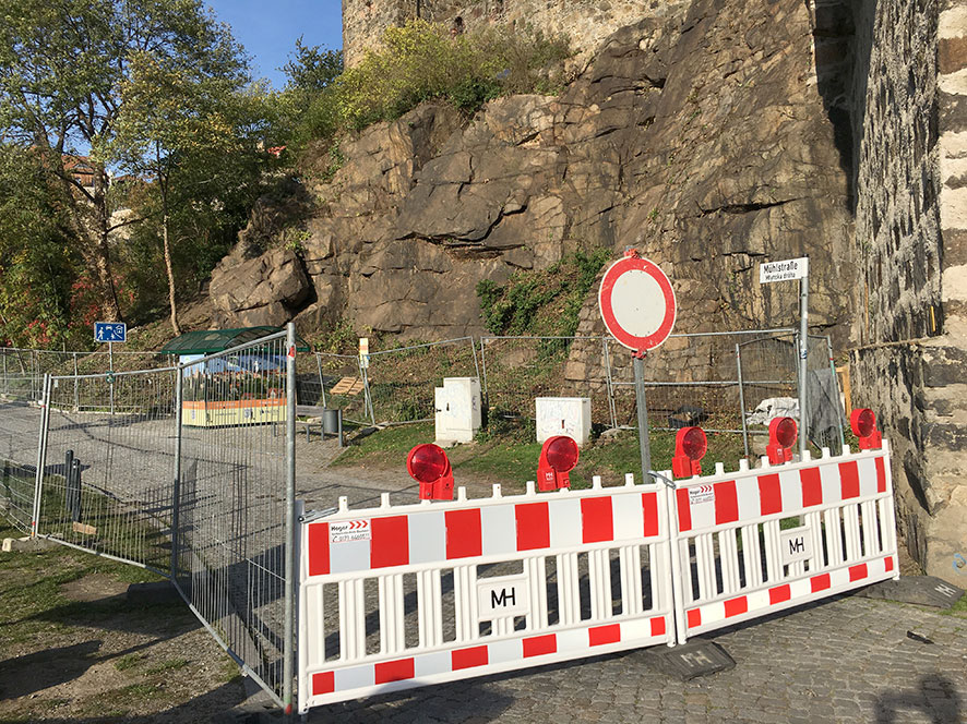 Seit einigen Tagen schneidet eine Fachfirma den Felsen neben der Alten Wasserkunst von Efeu und Bewuchs frei. Wie schon an anderen Abschnitten folgt diesem Arbeitsgang eine Felssicherung durch Bohranker und Netze. So der Plan. Denn an einer Stelle war das Wurzelwerk bereits so tief und massiv in eine Felsspalte eingedrungen, dass nun ein Absturz droht. Aus diesem Grund wurde vorsorglich die Mühlstraße in diesem Bereich für den Durchgangsverkehr gesperrt. Im nächsten Schritt wird die Fahrradgarage abgebaut. Bereits am Mittwoch (16. Oktober) soll der lockere Felsbereich mechanisch so bearbeitet werden, dass er abplatzt. Danach kann die Mühlstraße wieder freigegeben werden. Der Gesteinsbrocken ist zwar nicht riesig, das Herabstürzen kann aber nur unkontrolliert erfolgen. Es ist auch nicht auszuschließen, dass im Rahmen weiterer Grünschnittarbeiten erneut Sperrungen vorgenommen werden müssen. Verwaltung, Planer und Ausführungsfirma sind regelmäßig im Gespräch.