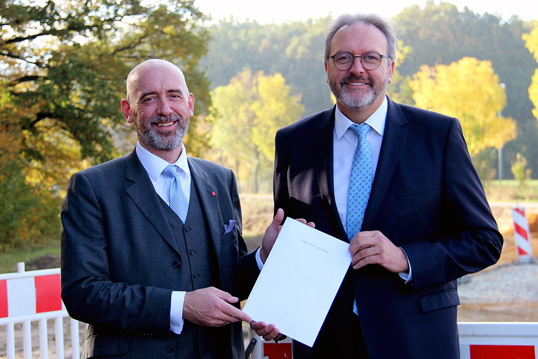 Die Große Kreisstadt Bautzen will die Verkehrssituation rund um das Bombardier-Werk verbessern. Bislang erfolgt die Zufahrt zum Gewerbepark, wo neben dem Bahntechnikkonzern rund 20 weitere Unternehmen ansässig sind, über ausschließlich eine Verkehrsachse aus östlicher Richtung. Der Freistaat Sachsen fördert diese Investition in die Infrastruktur mit fast 2,3 Millionen Euro*. Dies entspricht einer Förderung von rund 81 Prozent der gesamten zuwendungsfähigen Kosten. Stefan Brangs, Staatssekretär im Sächsischen Staatsministerium für Wirtschaft, Arbeit und Verkehr, hat den Fördermittelbescheid heute persönlich an Bautzens Oberbürgermeister Alexander Ahrens übergeben.