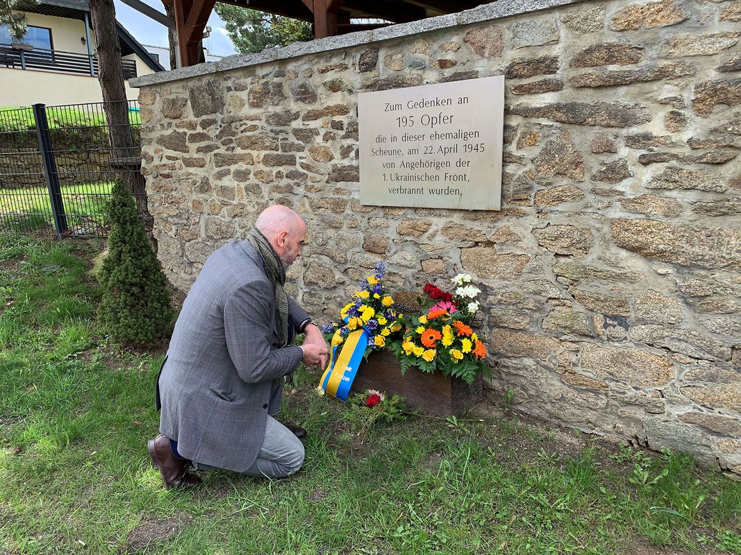 Der 22. April 1945 ist in die Geschichte eingegangen. Zu diesem Zeitpunkt lag der Zweite Weltkrieg in seinen letzten Zügen. In und um die Stadt Bautzen tobten heftige Kämpfe. In Niederkaina wurden an diesem Tag von Angehörigen der 1. Ukrainischen Front 195 Menschen in eine Scheune getrieben. Anschließend steckten sie das Gebäude in Brand. Auch heute, 76 Jahre später, gedenken wir der Opfer dieses Verbrechens. Oberbürgermeister Alexander Ahrens legte heute zwei Blumengebinde an der Gedenktafel in Niederkaina nieder. Ein Blumengebinde entstammt einer Spende einer Bürgerin. Sie ist der Annahme, dass auch ihr Vater bei dem Brand ums Leben kam. Bautzens Oberbürgermeister war es ein besonderes Anliegen, dem Wunsch der Frau nachzukommen und stellvertretend für sie ein zweites Gebinde niederzulegen.
