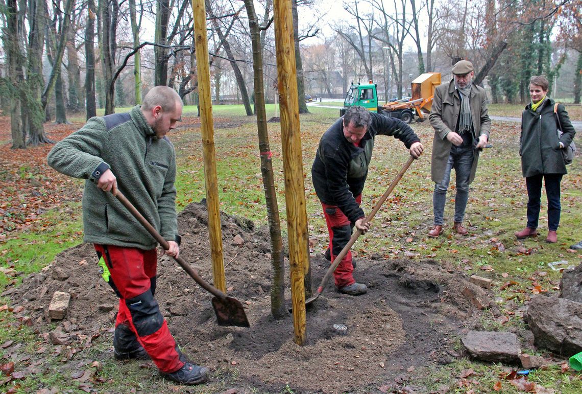 Bereits 27 Bäume wurden auf unterschiedlichen öffentlichen Flächen im Stadtgebiet in diesem Jahr gepflanzt. Diese sind in den meisten Fällen Einzelstandorte. Der Oberbürgermeister Alexander Ahrens und Frau Bürgermeistern Juliane Naumann machten sich selbst ein Bild von weiteren (Ersatz-)Pflanzungen auf dem Protschenberg, wo 12 einheimische Gehölze in die Erde kamen, darunter verschiedene Linden. Weitere 8 Bäume wurden in der Nähe der Heilig-Geist-Brücke gepflanzt: „Hier haben wir eher auf Vielfalt gesetzt. Es werden Bäume gesetzt, die z.B. durch ihren Blütenreichtum oder farbiges Blattwerk auffallen“, sagt Juliane Naumann. Damit meint sie beispielsweise Baumhasel, Tulpenbaum und Rot-Ahorn.