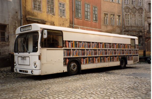 Zeit, zu feiern und einen Blick auf die Anfänge zu werfen, denn die Fahrbücherei der Stadtbibliothek ist einige Jahre älter. Begonnen hat alles 1991 mit der Übergabe eines gebrauchten MAN-Busses der Partnerstadt Heidelberg mit dem Ziel, Stadtteile und Ortschaften des Landkreises mit Lesestoff und anderen Medien zu versorgen. Im wöchentlichen Wechsel konnte von da an die Stadt- und Landbevölkerung in Wohnortnähe Medien ausleihen, die der Bus an den Haltepunkten geladen hatte. Allerdings war dieser 1998 so sehr in die Jahre gekommen, dass eine neue Lösung gefunden werden musste, um das etablierte Konzept weiterführen zu können. Denn schließlich warteten Kinder und Erwachsene bereits an den Haltestellen auf die Ankunft ihres Bücherbusses. Die Stadt Bautzen und der Landkreis einigten sich, gemeinsam ein neues Fahrzeug zu finanzieren. Seitdem ist der in der Stadtfarbe gehaltene blaue Bus regelmäßig vor Ort und fällt in den Straßen mit seiner üppigen Folierung auf, die auf seine Ladung und Auftrag hinweist, es ist eine Bücherwand.