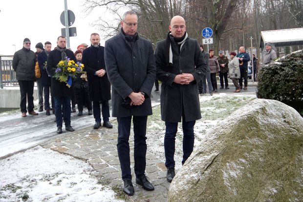 Etwa 35 Frauen und Männer unterschiedlicher Parteien, Einrichtungen und Initiativen trafen sich anlässlich des Zentralen Deutschen Gedenktages am 27. Januar am Gedenkstein für die Opfer des KZ-Außenlagers Groß-Rosen. Oberbürgermeister Karsten Vogt wies in seiner Ansprache darauf hin, dass Gewalt immer eine Folge von Intoleranz war und noch heute ist. Die beinahe täglichen Nachrichten von Übergriffen und Beleidigungen Andersdenkender oder Menschen anderer Nationalitäten und Glaubensrichtungen ist erschreckend. Dies bekräftigte der Landtagsabgeordnete Marko Schiemann anschließend und rief dazu auf, Gedenktage wie diese unermüdlich zu nutzen und so dem Vergessen entgegenzuwirken. Dass Intoleranz und Hass in Krieg umschlagen können, erleben wir gerade in der Ukraine, so Landrat Udo Witschas. Auch er warb für das Gedenken gegen das Vergessen.