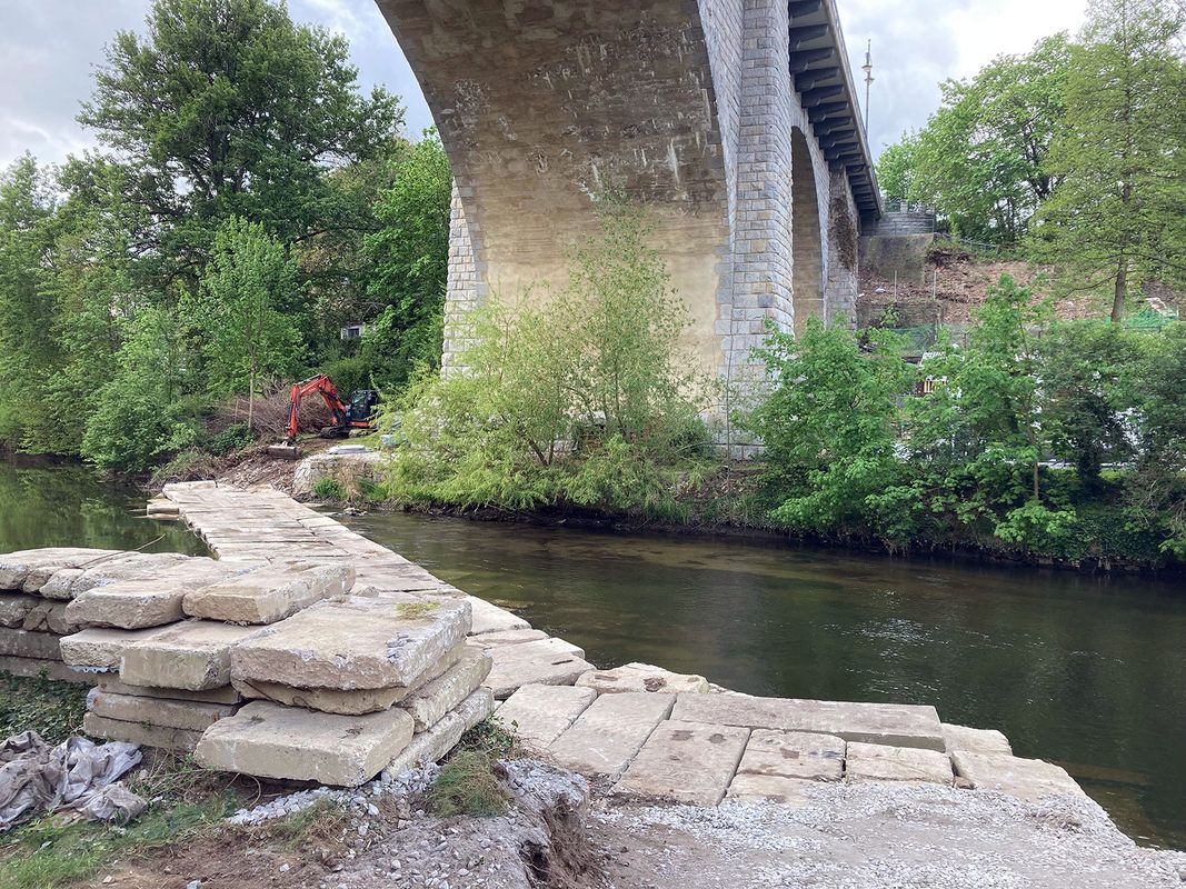 Die Bauarbeiten zur Sanierung der Stützwand entlang der Treppenanlage von der Friedensbrücke zum Uferweg haben begonnen. Für die Einrichtung ihrer Baustelle hat die bauausführende Firma Steinle Bau GmbH einen Teil der Parkflächen an der Fischergasse gesperrt. Die Treppenanlage selbst wird während der Bauarbeiten nicht begehbar sein. Zunächst errichtet die Firma eine Baustellenzufahrt durch die Spree und eine Baustraße bis zur eigentlichen Baustelle heran, bevor die eigentlichen Sanierungsarbeiten an der Stützwand beginnen.