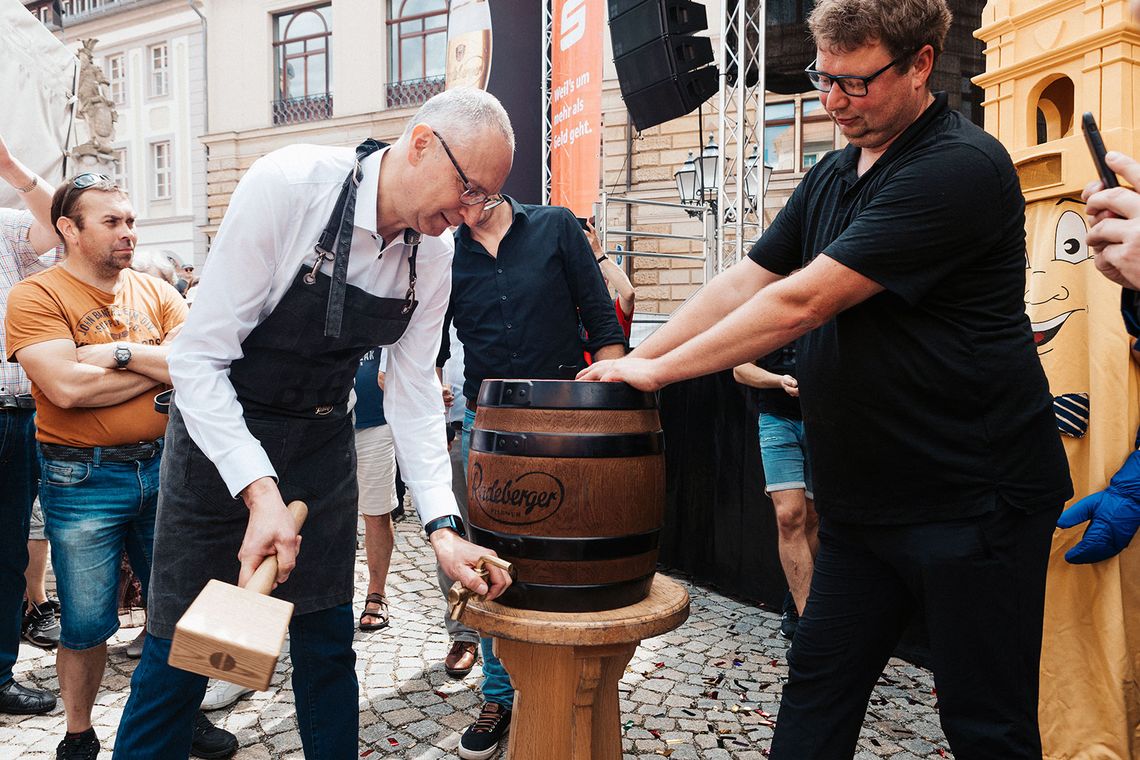 Natürlich durfte zum buntem Frühlingsfest ein farbenfroher Konfettiregen nicht fehlen. Ganz traditionell folgte der Fassanstich des Oberbürgermeisters, für den er in diesem Jahr nur drei Schläge benötigte. Für eine kühle Erfrischung standen die Besucher in langen Schlangen.