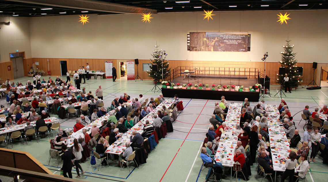 Eine festlich geschmückte Schützenplatzhalle, weihnachtlicher Duft und viele freudige Senioren feierten am Mittwoch die mittlerweile zur Tradition gewordenen städtische Seniorenweihnachtsfeier. Eingeladen hatte Oberbürgermeister Karsten Vogt, der selbst auch aktiver Teil des Programms war. Seiner Einladung folgten über 400 Senioren zur ausgebuchten Veranstaltung. Das knapp dreistündige Programm bot viele Überraschungen, die zum Mitsingen und Mitklatschen einluden. Den Beginn machten die Jüngsten, die Kinder der Kita „Purzelbaum“, der Dr.-Gregor-Mättig-Grundschule und der F.-J.-Curie-Grundschule mit vielen bekannten Weihnachtsliedern und Gedichten. Für das leibliche Wohl und den Tischservice sorgten die fleißigen Schüler des Philipp-Melanchthon-Gymnasiums.