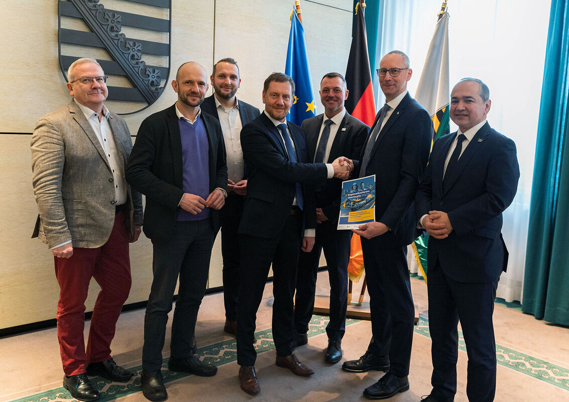 Was über 180 Entscheider aus Politik, Wirtschaft und Wissenschaft Ende des Jahres im Bautzener Landratsamt auf Initiative der Stadt Bautzen stellvertretend für eine ganze Region gefordert haben, wurde nun an die Staatskanzlei übergeben. Die Landräte Udo Witschas, Dr. Stephan Meyer, die Oberbürgermeister Karsten Vogt, Torsten Ruban-Zeh und Octavian Ursu sowie Heiko Nowak, Bautzens Bürgermeister für Stadtentwicklung und Bauwesen wurden am 17. Januar 2025 bei Ministerpräsident Michael Kretschmer empfangen. Mit im Gepäck: das Positionspapier der Regionalkonferenz mit der eindringlichen Forderung, die Elektrifizierung der Zugstrecke Dresden-Bautzen-Görlitz umzusetzen.