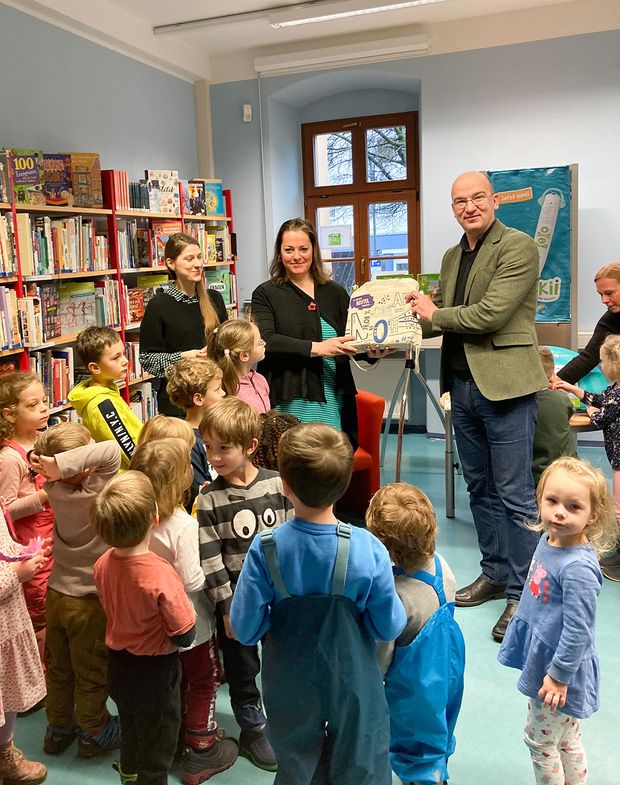 Am Freitag, den 9. Februar, war es endlich so weit: Die sorbischen Gruppen der Kita Glückskäfer und des Knirpsenlandes, sowie die Vorschulgruppe der Jan Radyserb-Wjela Kita, erhielten von Dr. Robert Böhmer, Bürgermeister für Finanzen, Ordnung, Bildung und Sicherheit, ein Bookii-Set für den Gruppengebrauch. Zwei Sets wurden von Bürgermeister der Gemeinde Doberschau-Gaußig, Alexander Fischer gestiftet, die Stadtbibliothek Bautzen stockte diese Spende um ein Booki-Set inkl. Plakaten auf, damit jede Einrichtung ein Set erhalten konnte. Auch Dr. Böhmer freute sich mit den Kindern und bemerkte: „Der Bookii-Stift fördert spielerisch die kognitiven Fähigkeiten der Kinder und trägt gleichzeitig zum Erlernen und Erhalt der sorbischen Sprache bei. Er ist ein guter Baustein für den Erhalt der sorbischen Kultur.“ Das Set umfasst neben zwei Büchern, einen Bookii-Stift auch ein Lernplakat.