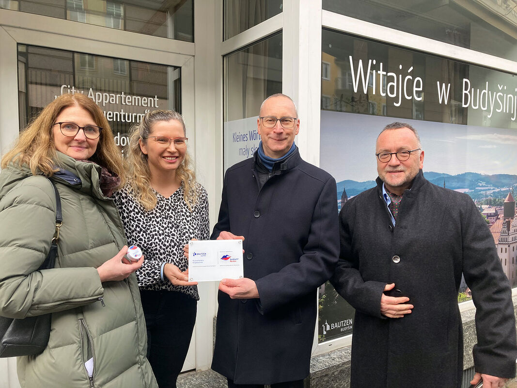 Die sechs Geschäfte haben nun am 10. Februar durch den Oberbürgermeister eine Plakette überreicht bekommen, aus der die Auszeichnung durch die Stadt und den Arbeitskreis ersichtlich wird. André Wucht, im Rathaus Ansprechpartner für sorbische Angelegenheiten und einer der Hauptinitiatoren, erklärt, wie das Schild entstanden ist: „Wir kennen alle die Aktion „Sorbisch, na klar“. Sie wird federführend im Sächsischen Staatsministerium für Wissenschaft, Kultur und Tourismus (SMWKT) organisiert und der blau-rot-weiße Mund ist im Stadtbild von Bautzen unübersehbar. Dank der Unterstützung aus dem Referat für Strukturwandel und lndustriekultur sowie der Fürsprache der Beauftragten für sorbische Angelegenheiten im SMWKT entstand ein gemeinsames Logo für Bautzen“.