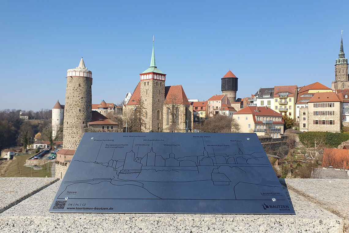 Die beeindruckendste Aussicht Bautzens ist zweifellos der Blick von der Friedensbrücke auf das malerische Spreetal und die historische Altstadt. Jährlich zieht dieser Anblick tausende Besucherinnen und Besucher an. Um den Gästen die Bautzener Silhouette mit ihren markanten Türmen und Basteien näherzubringen, wurden nun rechtzeitig zum Saisonstart an zwei Ausbuchtungen der Friedensbrücke neue Aussichtstafeln installiert.