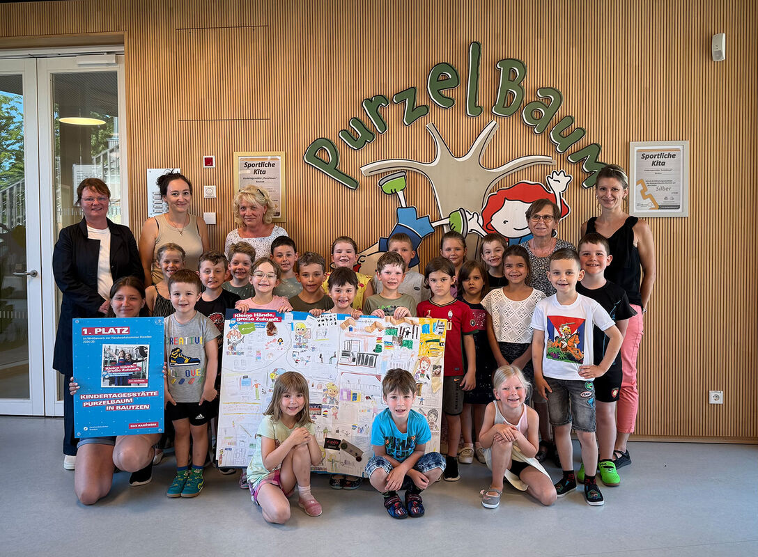 Beim Wettbewerb „Kleine Hände, große Zukunft“ der Handwerkskammer Dresden, hat die Vorschulgruppe der städtischen Kindertageseinrichtung „Purzelbaum“ den 1. Platz belegt. Über mehrere Wochen schnupperten die Kinder in verschiedene Handwerksberufe rein. Ihre Eindrücke und Erlebnisse beim Augenoptiker, Friseur, Orgelbauer, Elektroniker, Zimmerer, Tischler, Maler und in der Schneiderei veranschaulichten sie auf einem selbstgestalteten Poster. Dieses überzeugte die Jury nicht nur in seiner Kreativität, sondern auch in den Punkten Qualität und Interaktion mit dem Handwerk.