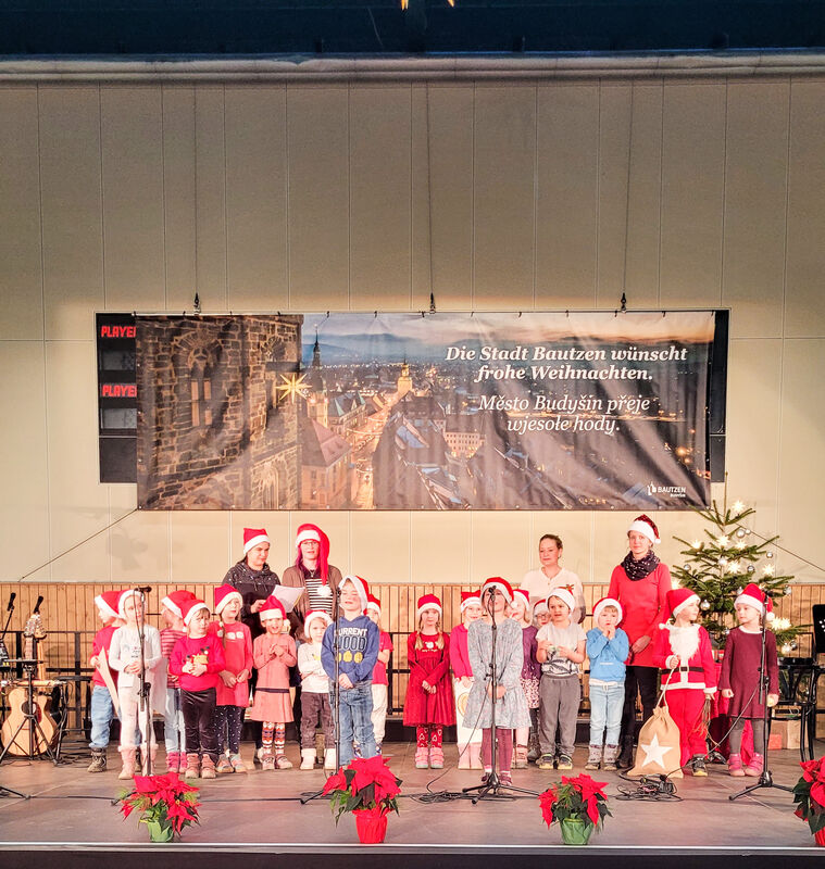 Besondere Freude bereitete der Auftritt der Kinder der Kindertagesstätte Purzelbaum, die mit ihren fröhlichen Weihnachtsliedern für viele lächelnde Gesichter sorgten. Eine stimmungsvolle Lesung der Stadtbibliothek Bautzen sowie das festliche Musikprogramm des Ensembles Bella Vita rundeten die Feier ab und trugen zu einer wohltuenden weihnachtlichen Stimmung bei.